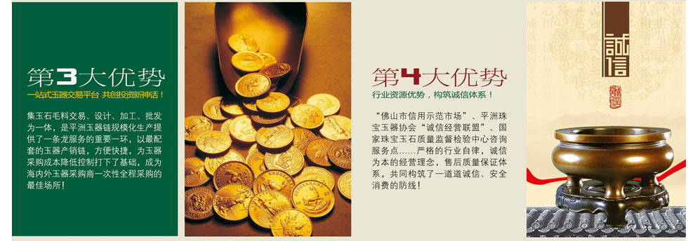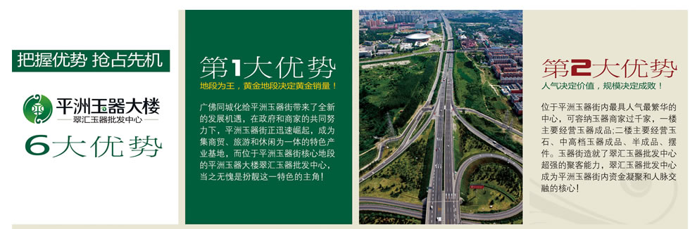 | 平洲玉器大樓位于平洲玉器街的核心地段,占地面積8500平方米,建筑面積11500平方米,是目前平洲玉器街“三舊”改造工程最大的一個項目和當地玉器產業升級的示范點。翠匯玉器批發中心是玉器大樓內的大型專業賣場,其一期09年3月正式開業后,發揮出強大的集散能力,迅速成為平洲玉器街的核心商家,其市場已覆蓋到包括香港、臺灣在內的全國各地以及韓國、東南亞等地區。 二期的商鋪主要用于經營中高檔玉器成品、半成品和精品。目前入駐的商家中以擁有自主品牌或具品牌意識的玉器商家為主,近七成來自于緬甸、云南、福建、四會、廣州、揭陽、臺灣等地,吸引了包括新加坡國際珠寶品牌永恒珠寶有限公司、四會玉器龍頭企業“精英翡翠玉雕廠”等一線實力玉器廠家入駐。 |