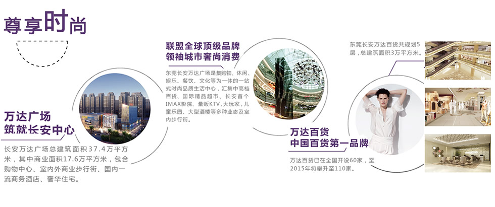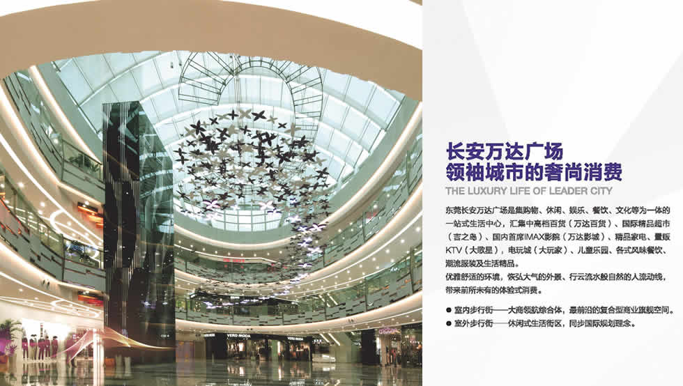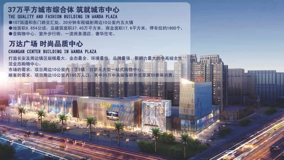 東莞長安萬達廣場是萬達集團在東莞市的開篇之作,總建筑面積37萬平方米,包括了18萬平方米的大型商業(yè)廣場,廣場內(nèi)設(shè)有萬達百貨、萬達IMAX影城、大歌星量販式KTV、大玩家超樂場、永旺茉莉幻想兒童樂園、吉之島超市以及140余家國內(nèi)外著名品牌,將為消費者提供了一個全方位體驗式消費的生活空間。