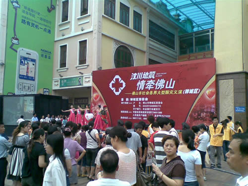 5月17日晚,由佛山市紅十字會、佛山市慈善會和佛山傳媒集團(tuán)主辦、佛山東方廣場協(xié)辦的"汶川地震,情牽佛山"--佛山各界大型賑災(zāi)義演在佛山東方廣場舉行。東方廣場,東建世紀(jì)廣場作為活動募捐點(diǎn),公開接受市民的捐贈。同時,在佛山新聞中心佛山電視臺一號演播廳對活動進(jìn)行直播。