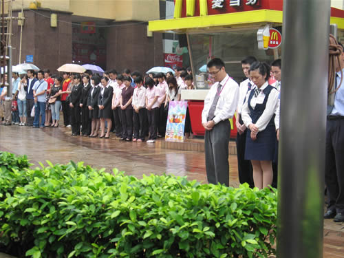另悉,根據(jù)國務(wù)院公告,為表達(dá)全國各族人民對四川汶川大地震遇難同胞的深切哀悼,國務(wù)院決定,2008年5月19日至21日為全國哀悼日。在5月19日14時28分,東方廣場在全國哀悼日下半旗向四川省汶川大地震遇難同胞志哀,同時,全體管理人員參加了下半旗儀式,以表達(dá)對在四川汶川大地震中遇難同胞的哀悼。