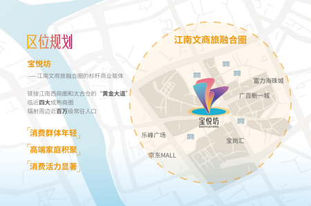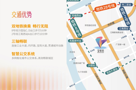 1.區位優勢與交通 寶悅坊位于江南文商旅融合圈的核心地帶,是鏈接江南西商圈和太古倉的“黃金大道”。項目輻射周邊四大成熟商圈,覆蓋近百萬級常住人口,消費活力顯著。交通方面,項目擁有雙地鐵換乘優勢(8號線沙園站步行5分鐘、2號線江南西站步行10分鐘),并通過工業大道、內環路、寶崗大道三軸暢聯城市動脈,結合智慧公交系統,實現高效暢聯城區。