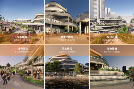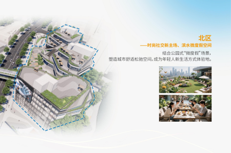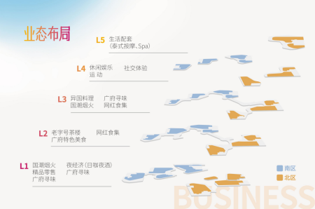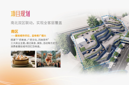 3.業態規劃與主題分區 項目通過南北雙區聯動實現全客層覆蓋,并以“粵味、粵享、粵趣、粵潮”四大主題滿足老廣家庭、新生代全齡段消費需求: 1)南區:重拾城市印記,品味老廣煙火+北區:時尚社交新主場,濱水微度假空間