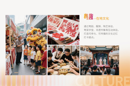 2.項目定位與規劃 項目以“精致煙火氣,悅享新生活”為定位,聚焦“有文化、有故事、有場景”三大維度: 有文化:深挖南粵民俗文化基因,通過粵劇、醒獅等互動體驗,讓傳統與當代對話。 有故事:延續寶業路“宵夜大排檔”情懷記憶,打造城市記憶打卡地。 有場景:構建“文化+美食+社交+潮玩”全時態體驗空間,重塑商業活力。