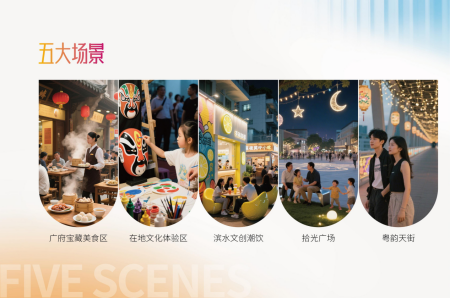 4.場景亮點與運營支持 項目規劃五大場景:廣府寶藏美食區、在地文化體驗區、濱水文創潮飲、拾光廣場及粵韻天街,并通過多元活動和專業運營賦能商家、全方位市場推廣助力品牌破圈增長,確保項目可持續活力。