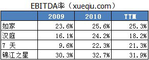 漢庭EBITDA率從24.2%下降至18.2%是因?yàn)?010年世博會(huì)和新開直營(yíng)店的影響;2011年上半年在沒有了世博效應(yīng)的情況下依然比上年同期多開24家直營(yíng)店。今后漢庭如果繼續(xù)保持直營(yíng)店的增速,他的盈利能力依然會(huì)相對(duì)較低。因?yàn)閬碜约用说晔杖氲睦麧?rùn)率高于直營(yíng)店的利潤(rùn)率;所以7天和如家的EBITDA率將隨著加盟比例的提升獲得進(jìn)一步增長(zhǎng);但凈利率方面,如家會(huì)受2.5億美元的貸款利息支出和莫泰虧損所拖累。