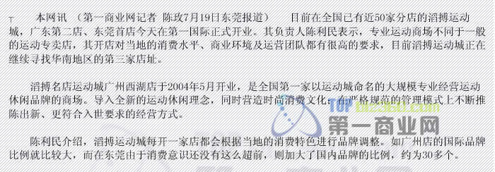 提要:目前在全國已有近50家分店的滔搏運動城,廣東第二店、東莞首店今天在第一國際正式開業(yè)。其負責人陳利民表示,專業(yè)運動商場不同于一般的運動專賣店,其開店對當?shù)氐南M水平、商業(yè)環(huán)境及運營團隊都有很高的要求,目前滔搏運動城正在繼續(xù)尋找華南地區(qū)的第三家店址。
