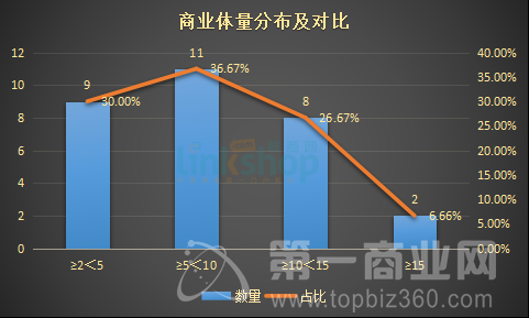 3、5-10萬方規模購物中心是主流 新開商業項目中,除九江聯盛中翰廣場面積未知外,其他規模在5至10萬方(含5萬方,不含10萬方)數量最多,占比約36.67%;2至5萬方(含2萬方,不含5萬方)占比約30%;10至15萬方(含10萬方,不含15萬方)占比約26.67%;15萬方以上(含15萬方)占比約6.66%。