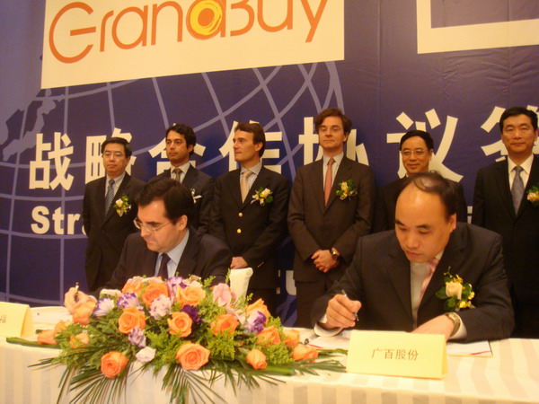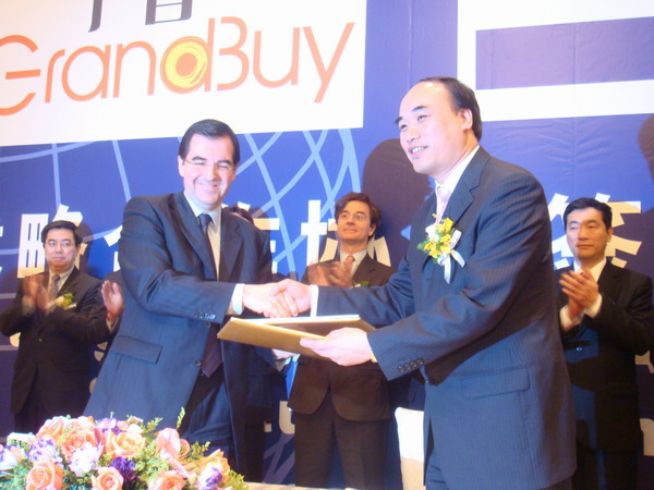 家樂福中國區副總裁貝多拉(左)與廣百股份董事總經理黃永志簽署戰略合作協議