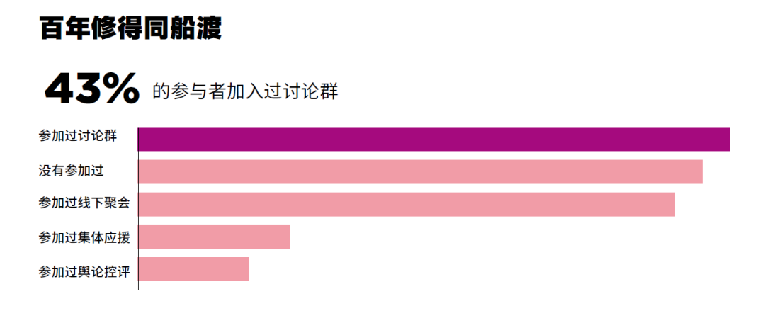c. 商業成長力:與子同袍。漢服是最普遍的國風文化產品。一位國風深度愛好者這樣解讀時下漢服的流派: 現在漢服分為兩大流派,一個是循古,以遵循古制為主旨;另一個是仙女服,好看就行,符合大家心目古裝的形象,但其實并不遵循傳統形式。我覺得兩種流行的共存是非常正常的,美應該是包容的。 d. 社會美譽力:回眸一笑百媚生。有52% 的青年都表示喜歡國風文化。 e. 自發傳播力:請君為我傾耳聽。93%的參與者表示會參與有關國風文化的討論,其中還有大部分會主動推薦、向感興趣的人介紹。 f.社群聚合力:百年修得同船渡。43%的參與者表示都加入過相關的討論群,并且參加過線下聚會的比例也不低。