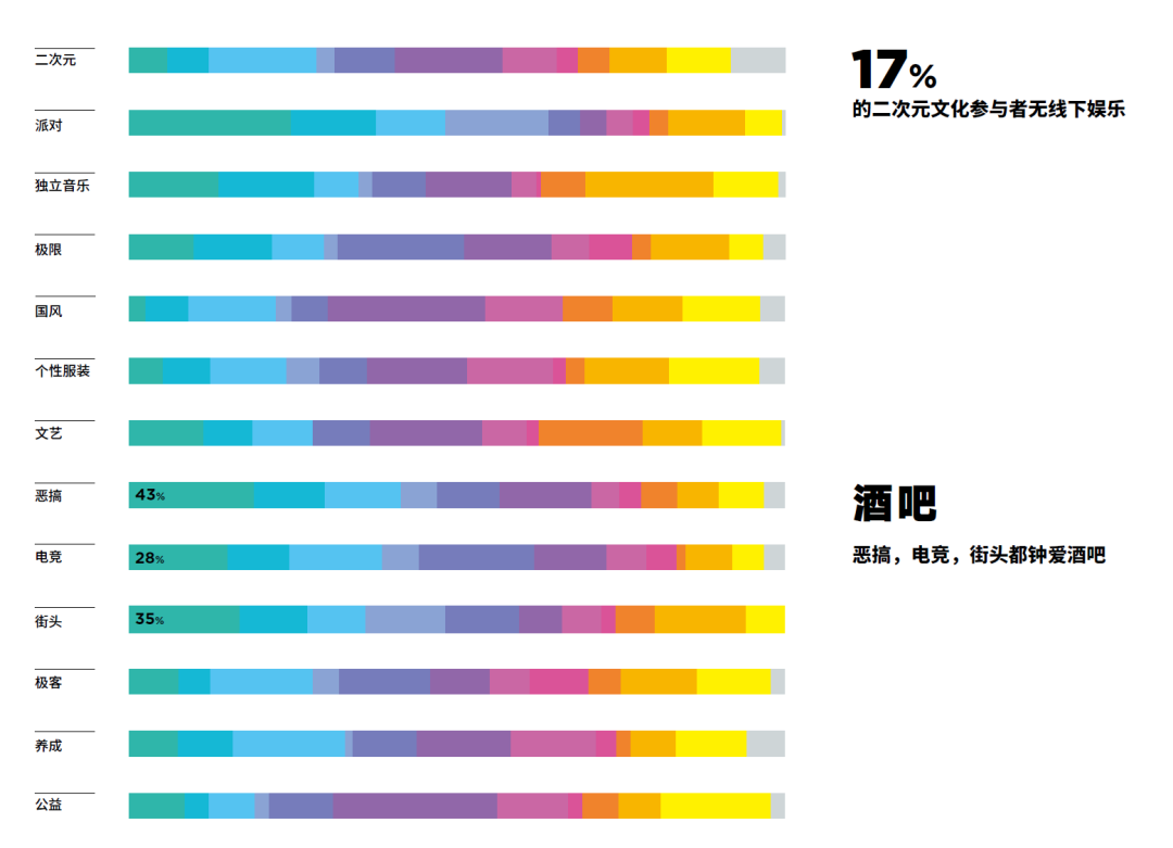 7、與其約會吃飯,不如攢錢買手辦 各類文化群體約會就餐人均花費集中在100-300元,其中個性服裝文化群體的餐飲消費能力最強,極客、養成、惡搞、二次元等文化群體的人均花費較低。 8、富有科學精神,也愛優雅餐廳 以極客群體為代表,青年外出就餐時除口味外最看中環境氛圍和品質格調,其中派對文化群體受網紅、明星、自媒體的影響較大。 9、“慎入”!惡搞青年出沒酒吧 各類文化群體參與比例最高的線下娛樂形式為文藝書店、密室逃脫、酒吧,其中惡搞、電競、街頭都選擇了酒吧,而17%的二次元文化參與者無線下娛樂。