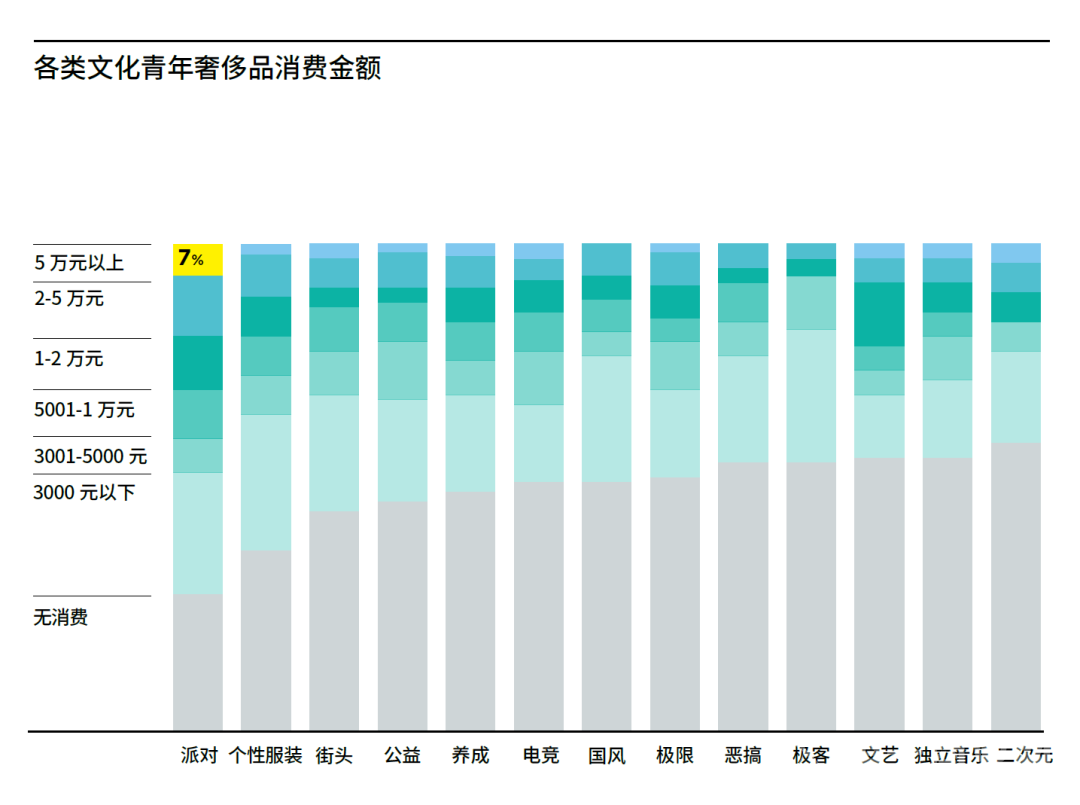 4、偶像帶貨,瘋狂打CALL 各群體品牌好感主要來自設計品味和舒適度,其中惡搞、公益、極客文化群體對舒適度更為注重,養成文化群體格外偏好偶像代言類品牌,文藝和派對群體也關注設計的與眾不同。 5、派對動物就要驚艷全場 多數文化群體中,約50%的青年近一年未購買奢侈品,其中派對群體的奢侈品消費支出最高,極客群體奢侈品購買力最低。