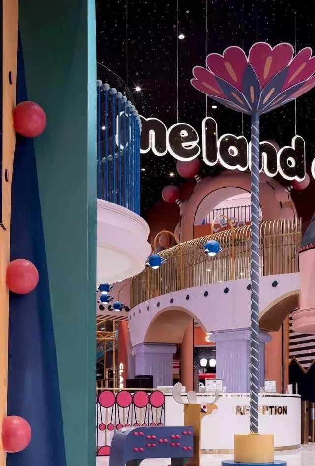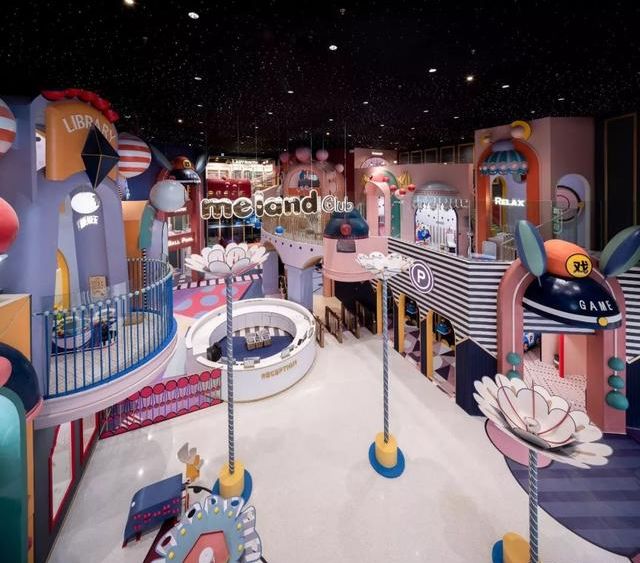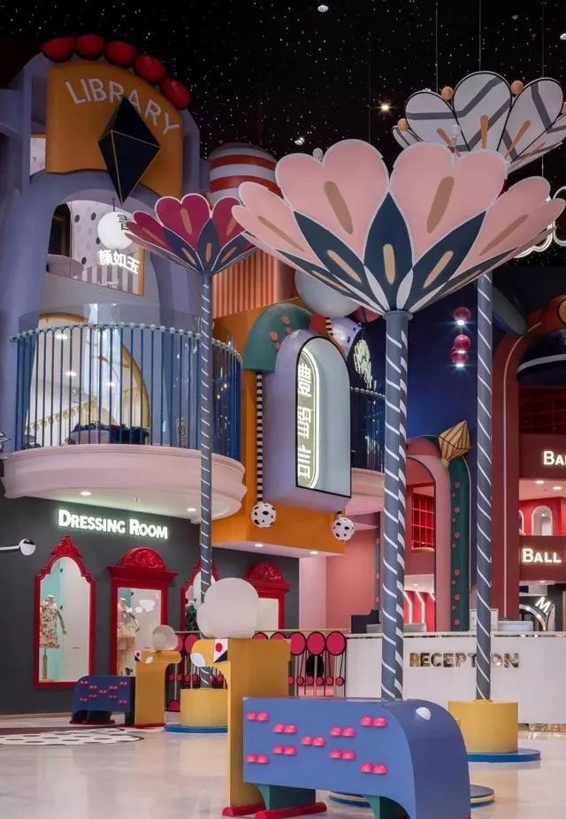 主題區域中,親子樂園品牌Meland Club所位于區域獨具的挑高空間,被靈活運用打造成了開放式前臺接待區,讓其成為整個兒童主題區中一個矚目的存在。標志性卡通人物戴上了昆曲盔頭,引據了古文中的稱謂與典故來指代區域標識。