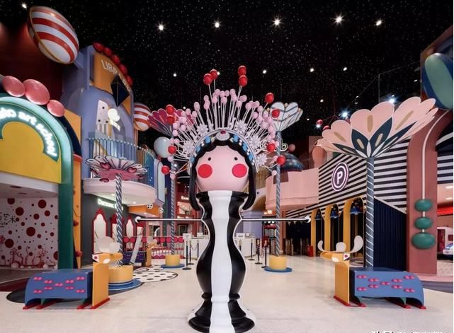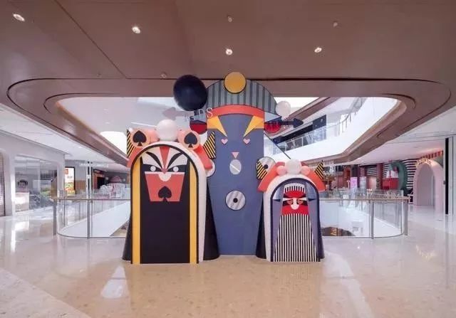 云肩、水袖、云帚、盔頭、臉譜、樂器等傳統元素通過設計語言的轉譯,成為更易被小朋友喜愛和接納的可愛符號,不僅裝飾了公區內的大型卡通裝置,也被糅合進了商鋪門頭標志的設計。
