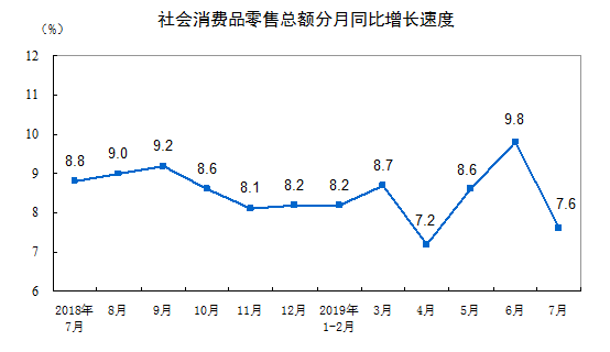 從國家統計局獲悉,2019年7月份,社會消費品零售總額33073億元,同比名義增長7.6%(扣除價格因素實際增長5.7%,以下除特殊說明外均為名義增長)。其中,除汽車以外的消費品零售額30017億元,增長8.8%。