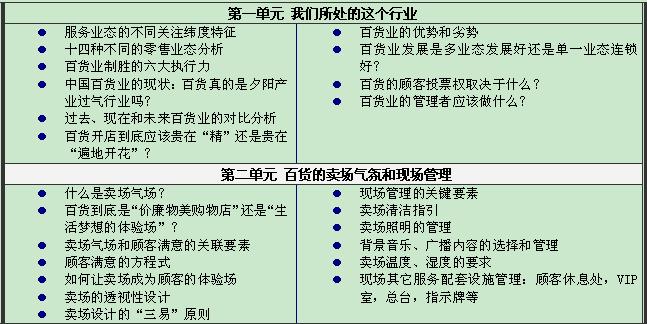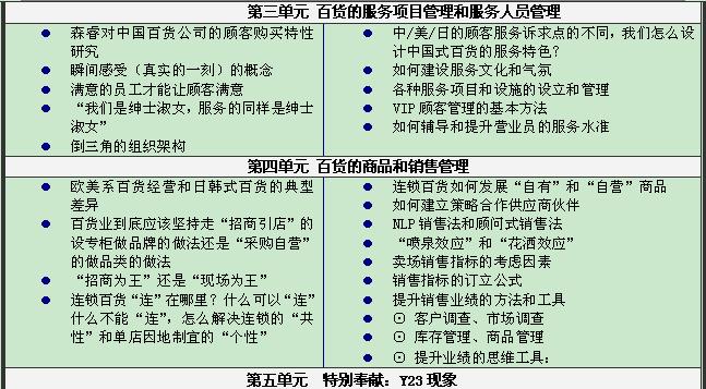 第一課:行業(yè)探底:清晰百貨概念,掌控時(shí)運(yùn)拐點(diǎn),歷史、當(dāng)下與趨勢(shì)…… 第二課:藏風(fēng)聚氣:百貨賣場(chǎng)氛圍及現(xiàn)場(chǎng)管理,巧處著手…… 第三課:一品服務(wù):百貨服務(wù)項(xiàng)目管理和服務(wù)團(tuán)隊(duì)管理…… 第四課:需求壓倒一切:為什么連鎖,為什自營(yíng),為什么不贏…… 第五課:鎖住那顆心:VIP顧客管理…… 第六課:賣翻天:銷售奇跡從明天開(kāi)始…… 第七課:連通世界:體會(huì)歐美經(jīng)典,念念日韓經(jīng)……