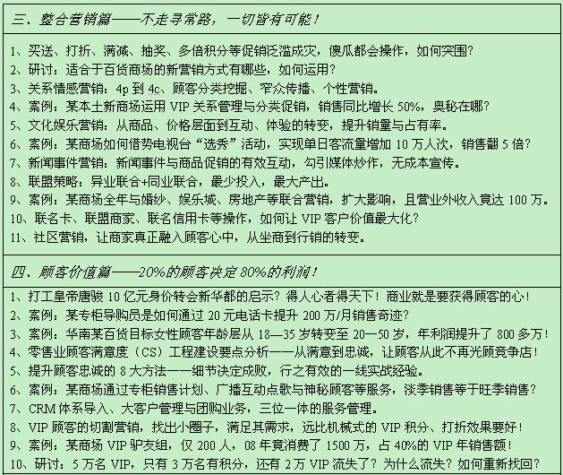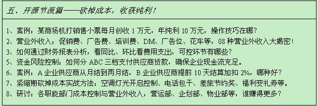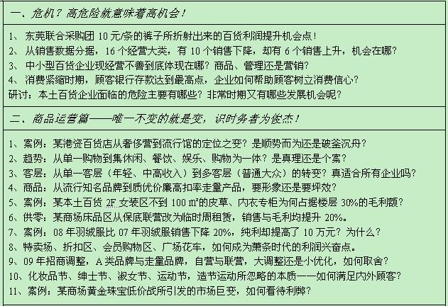 ·金融危機對百貨實體影響過程分析,如何制訂時間戰略分解應對! ·商品結構、合作條件、經營方式等轉變,讓顧客得到滿意商品,讓供應商緩解經營壓力! ·從整合營銷、異業聯盟、VIP個性營銷等,來提高活動吸引力及促銷利潤! ·通過顧客滿意度建設、客戶關系管理,提高顧客來店率與購買頻率,提升銷售! ·如何對貨款、水電、稅費、經營費用等成本控制,減少開支,擴大營業外收入!