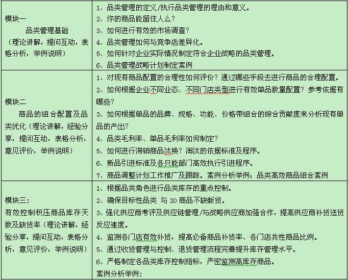 本課程將重點(diǎn)為企業(yè)中層干部解決以下問題: 1、 了解顧客需求并且不斷發(fā)展新的銷售增長(zhǎng)點(diǎn)。 2、 怎樣利用企業(yè)現(xiàn)有的信息系統(tǒng)完成日常的數(shù)據(jù)分析工作。 3、 怎樣才能讓科學(xué)的、精細(xì)化的、系統(tǒng)的品類管理方法在您的企業(yè)有效實(shí)施。 4、 改善空間貨架陳列,提高空間產(chǎn)出率。 5、 獲得供應(yīng)商的大力支持,供應(yīng)商戰(zhàn)略協(xié)同更加緊密。 6、 掌握商品庫存,促進(jìn)品類優(yōu)化的核心方法。提升企業(yè)核心競(jìng)爭(zhēng)力,實(shí)現(xiàn)差異化競(jìng)爭(zhēng)。 7、 商品分類更趨合理,單品貢獻(xiàn)率迅速提高,提升平米業(yè)績(jī)。