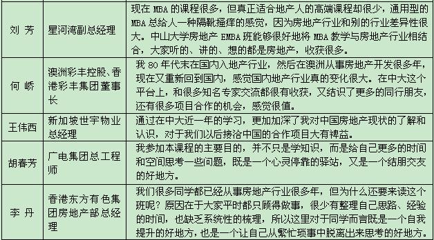 1、 結(jié)業(yè)由中山大學(xué)頒發(fā)《中國(guó)房地產(chǎn)企業(yè)家工商管理班》鋼印證書(可另申請(qǐng)學(xué)位證書)。 2、 學(xué)員將作為中山大學(xué)校友,入編《中山大學(xué)校友錄》,坐享中大近百年的人脈資源。 3、 提供動(dòng)態(tài)終身學(xué)習(xí)系統(tǒng):畢業(yè)學(xué)員參加我院今后舉辦其他所有課程均只收取會(huì)務(wù)費(fèi)。 4、 提供與政府、業(yè)內(nèi)及相關(guān)行業(yè)交流平臺(tái),拓寬信息渠道,尋求合作伙伴,整合資源。 5、 組織赴國(guó)外、香港、北京、上海等地知名樓盤實(shí)地考察,學(xué)員樓盤實(shí)地案例研討。 6、 組織各類交流聯(lián)誼、管理游戲等活動(dòng),寓教于樂,輕松交流。 7、 針對(duì)學(xué)員實(shí)際問題的專題研討。