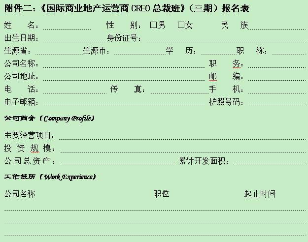 說明: 1、《國際商業地產運營商CREO總裁班》(三期)將于2009年3月27日開課,整個課程學習一年,每兩月集中授課3天1晚(周五至周日),采取現場授課原則。全年課程計劃可來電索取。以下為全年課程計劃的首次課程安排。 2、《國際商業地產運營商CREO總裁班》(三期)將采取比較靈活的學習方式,可整體一年學習,學費3.8萬元(含結業證書);可單次學習,每次三天,學費8000元整(不含結業證書)。