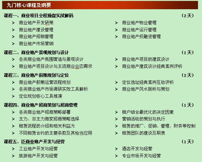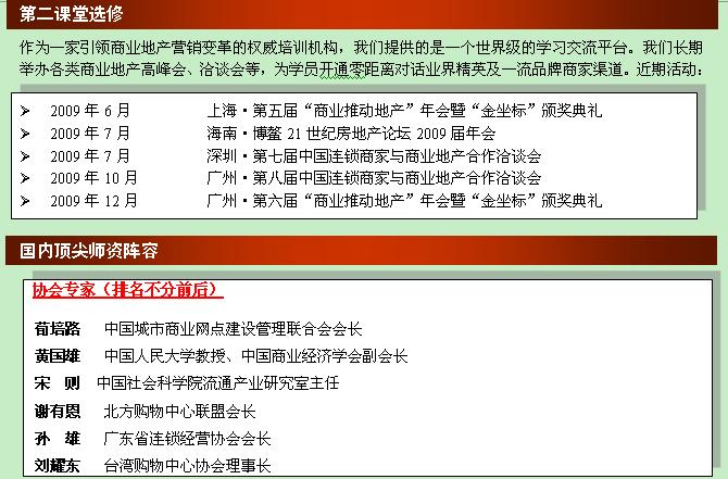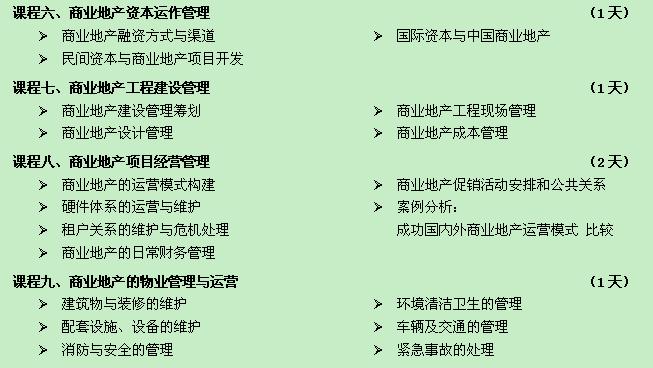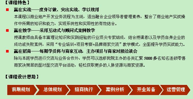 學制:歷時4個月,每月下旬的一個周末上課,每次3天,共12天。首期開學時間為2009年5月15日。每月課程為獨立模塊,可隨時插班學習。 上課地點:以上海、廣州為主,并在當地各安排(1-2次)當地標桿商業項目考察。