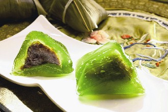 (圣娜多堡主推《寒天冰心粽》,強調外皮添加寒天、山藥等健康食材,內餡包裹紅豆、地瓜與奶皇等餡料。)