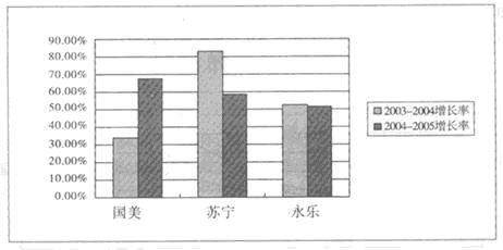 首先,從三巨頭的銷售額增長率來看(圖2),國美于2004-2005年度以67%的增長率領先于59%的蘇寧及51%的永樂。而在2003-2004年度蘇寧則以82%的增長率拔得頭籌。