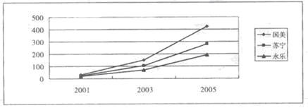 圖3國美、蘇寧、永樂2003-2005年銷售額比較