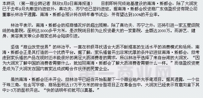 提要:目前即將完成地基建設的南!ば露紩,除了大潤發已于去年9月先期簽約進駐外,真功夫、蘇寧也已簽約進駐。據南!ば露紩顿Y商廣東信盈投資有限公司董事長林治平透露,南海·新都會預計將在明年春節試業,并有望達到100%的開業率。