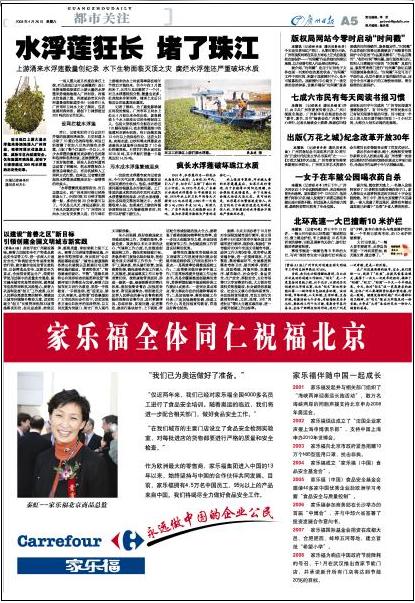 繼4月25日,法國連鎖超市家樂福在《廣州日報》第20版做了半版形象廣告后,25日繼續在《廣州日報》A5版做了半版形象廣告,題為“家樂福全體同仁祝福北京”。