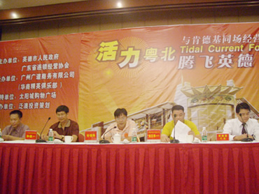由英德市政府、廣東省連鎖經營協會共同主辦,廣州廣道商務有限公司(華商精英俱樂部)承辦,英德太陽城購物廣場支持的“活力粵北 英德騰飛——2007英德重點商業項目推介會”,7月20日在英德市隆重舉行。英德市副市長劉偉秋、英德市外經貿局局長劉建文、招商局副局長李飄飄、廣東省連鎖經營協會會長孫雄,英德市國稅局、地稅局、建設局、規劃局、工商局和質監局等相關政府部門負責人出席了此次的活動。